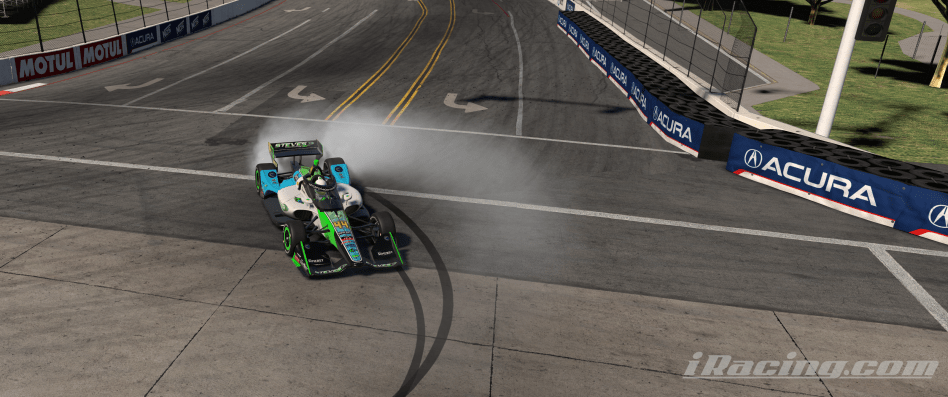 The next race was at Long Beach. This race was perhaps the most unforgiving, as the concrete walls were ever present and loomed large on everyone’s mind. I finally cracked the front row in qualifying, and was looking good on strategy for the race. I started on soft tires, where the pole-sitter and championship leader started on the prime (hard) tire. I got around them on the first lap and started to pull a gap. I managed to save enough fuel on the first stint to only 1-stop and despite a bit of damage after scraping a wall in the middle of the race, I ended up taking the win and leading the most laps!