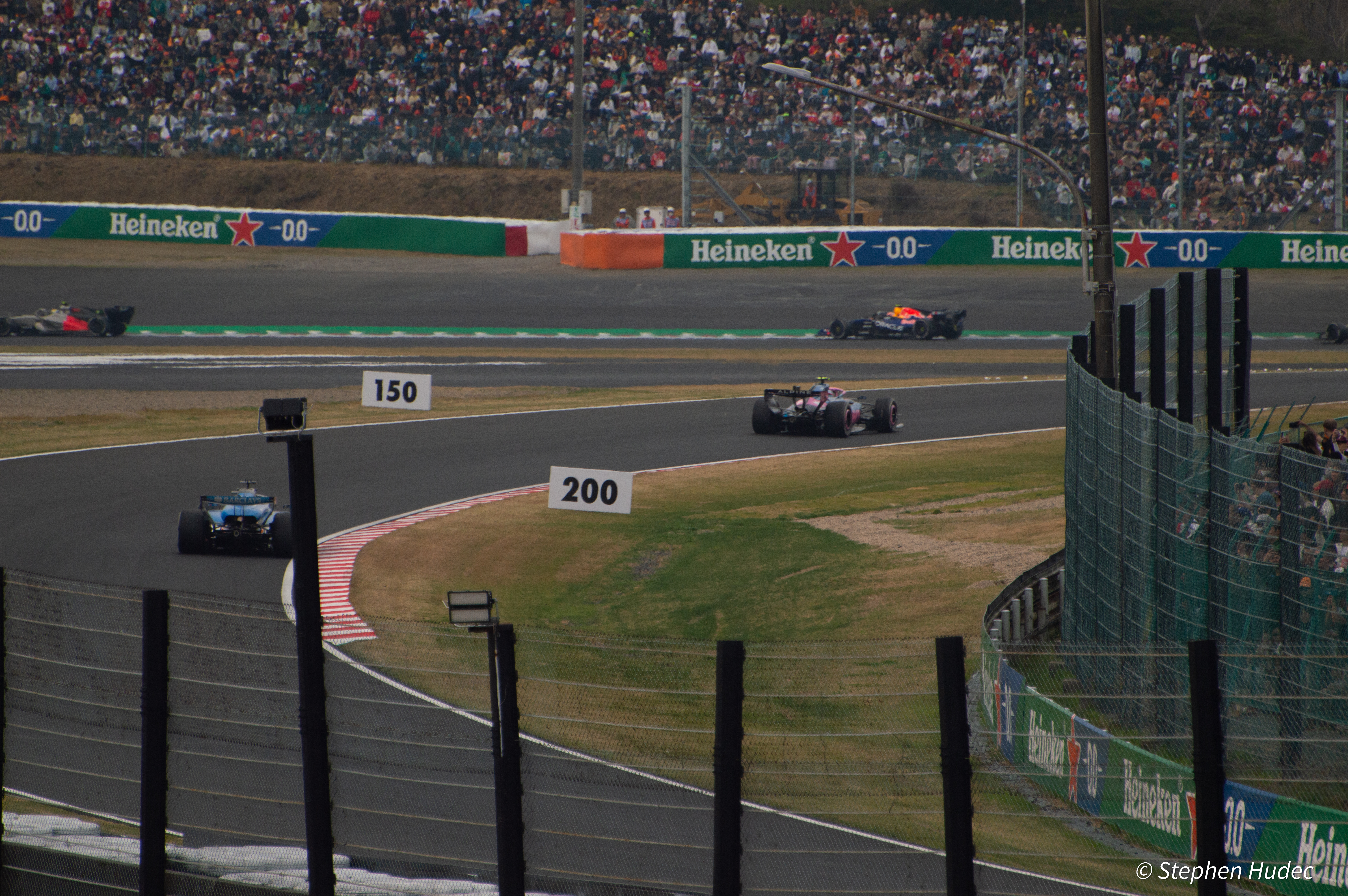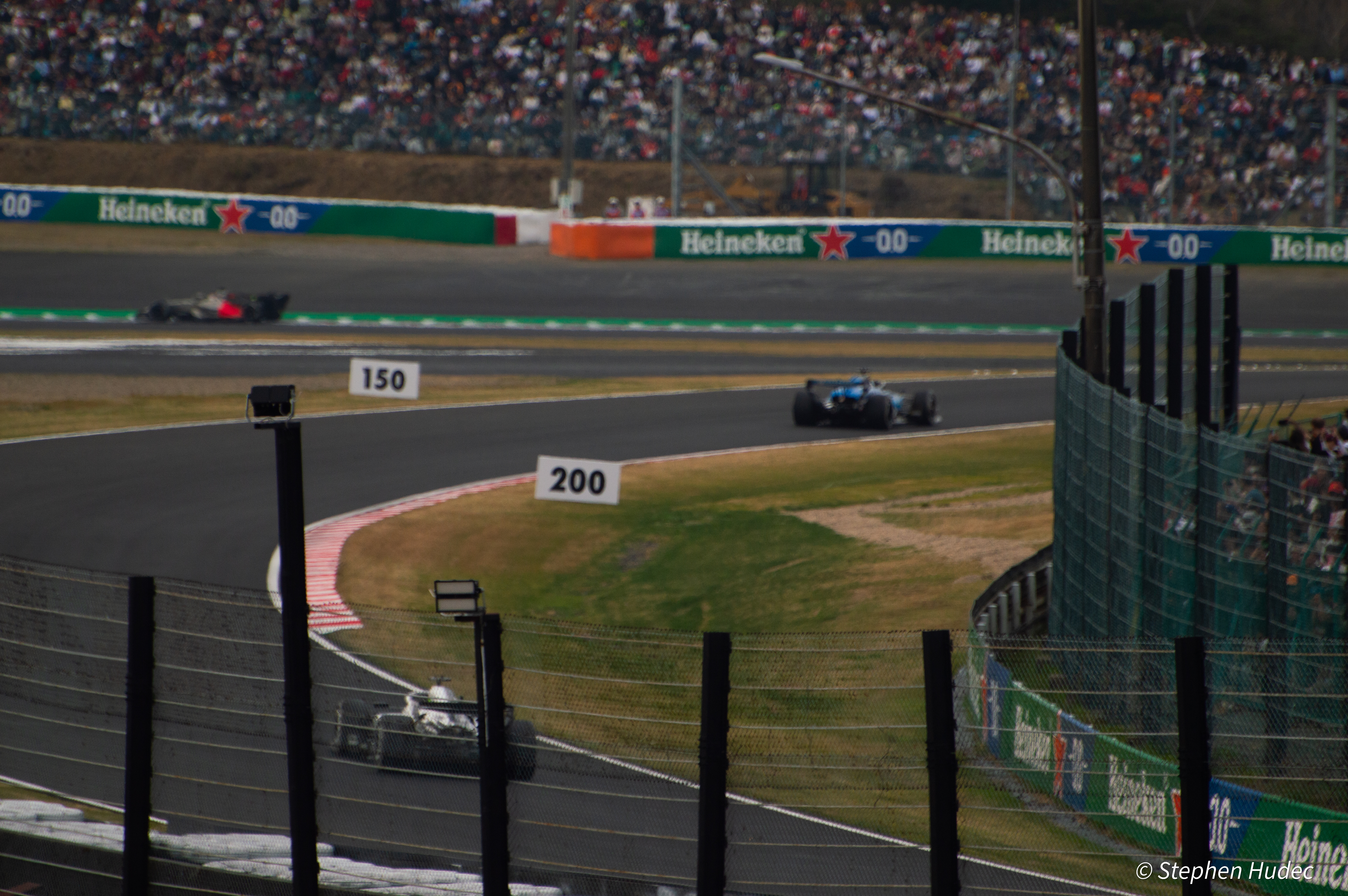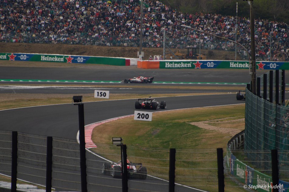 We had admission passes for the back half of the track, so we had to wait another 45mins for an internal shuttle bus to put us by the straight on the run to 130R. We got to our section with 15mins to spare before the start of the F1 race. We left Osaka at 7am thinking we’d get there for 10am so we could watch the support races and walk around the track a bit. Nope, not a chance.